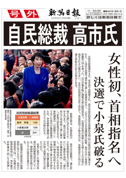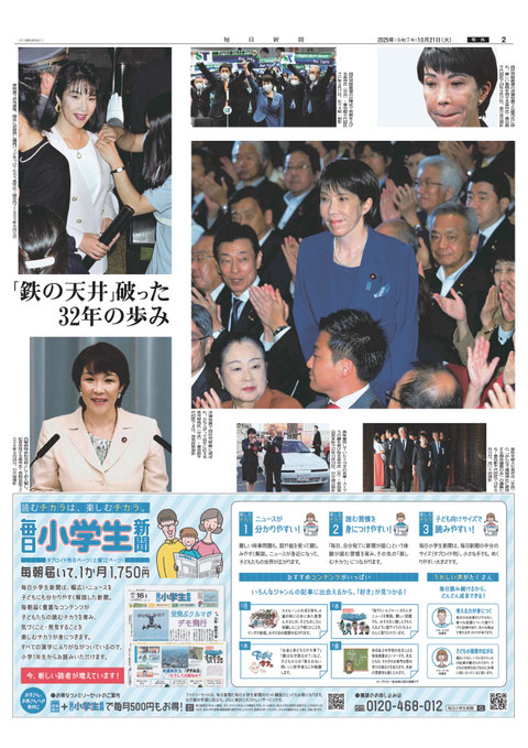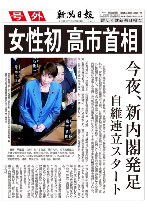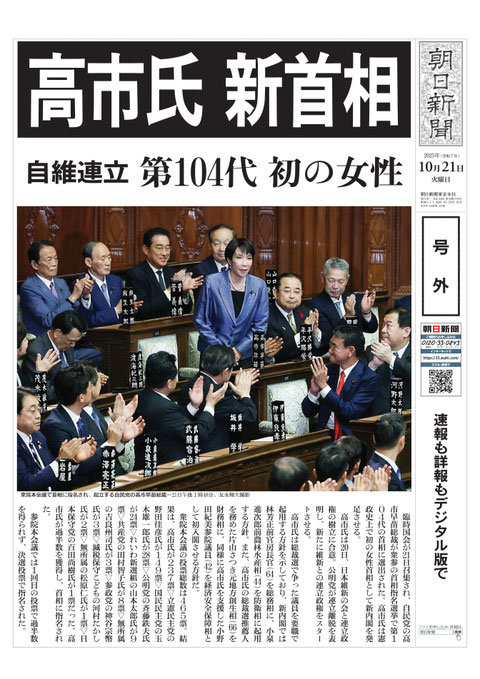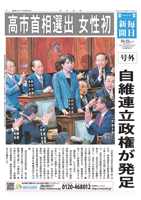 【毎日新聞・号外10/21】高市首相選出 女性初